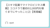 初めまして。スキルマーケットのココナラを中心に活動しつつ、「スキマ起業のススメ: ローリスク・ローストレスで月5万以上稼ぐためにやったこと全部書く」というKindle本を出版したWebプログラマのayan(えーやん)と申します。