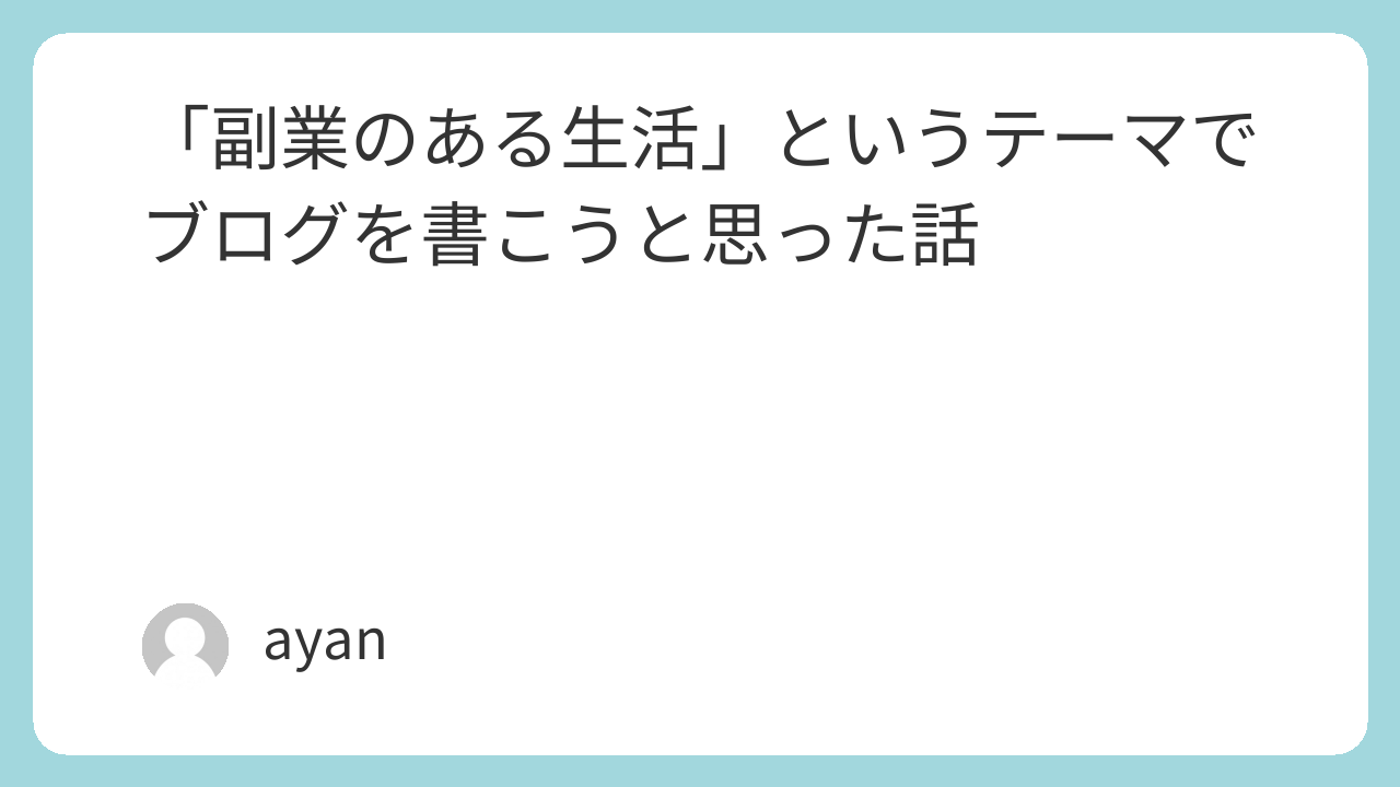 初めまして。スキルマーケットのココナラを中心に活動しつつ、「スキマ起業のススメ: ローリスク・ローストレスで月5万以上稼ぐためにやったこと全部書く」というKindle本を出版したWebプログラマのayan(えーやん)と申します。Unlimitedでも読めますので、もしこのブログに興味を持って下さった方がおられましたら是非読んでみてください!また、SNS(X)での交流などもしたいのでフォローお待ちしております!